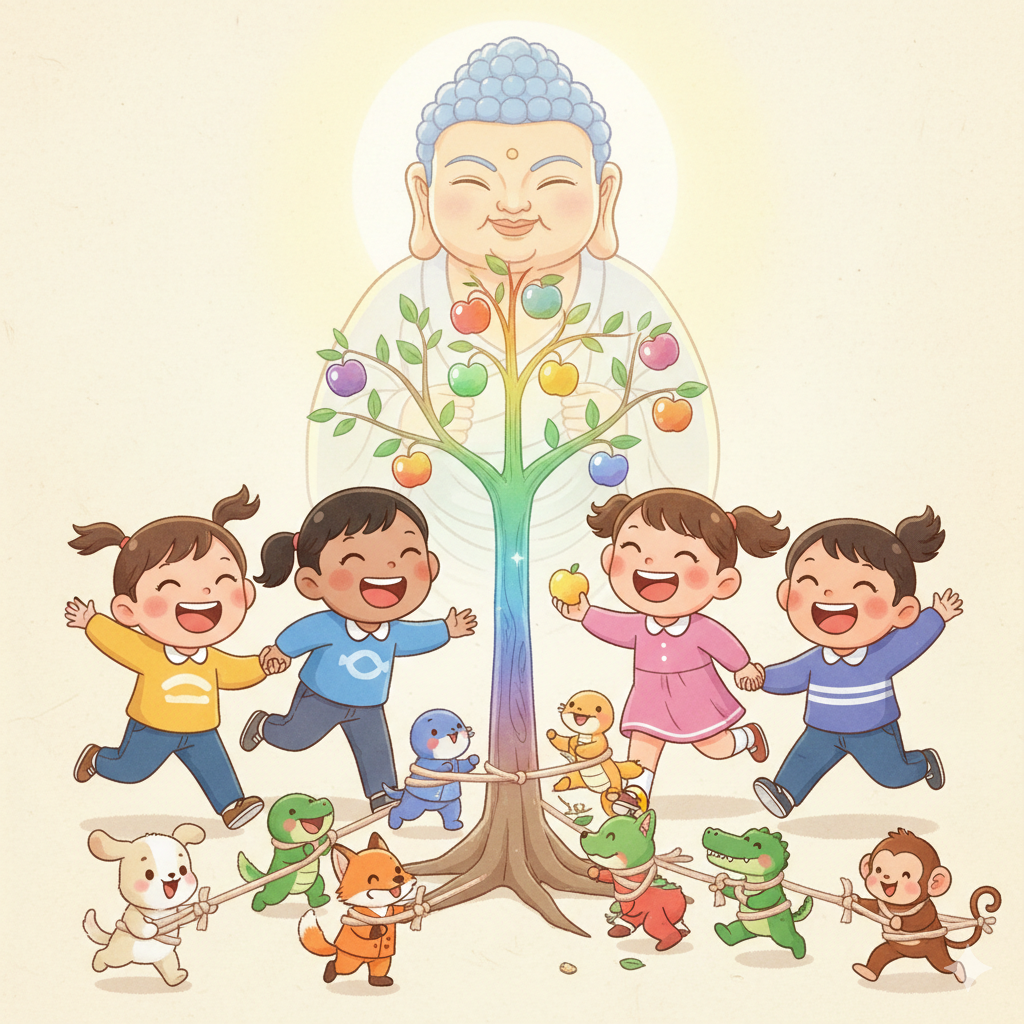 日本語: 明るく温かいGoogleナノバナナスタイルのコラージュ。画面中央では、きちんとしたカラフルな服を着た子供たちが、まん丸の明るい笑顔で駆け回っている。彼らの後ろでは、慈悲深い微笑みを浮かべた仏陀のキャラクターが、やわらかな光を放ちながら座り、その光は子供たちの体から生えている透明な虹色の「心の秘密の木」を照らしている。この木は丈夫でまっすぐ伸び、根元には六匹の可愛い動物キャラクター(子犬、小鳥、いたずらな蛇、賢い狐、勇敢なワニ、お茶目な猿 — みんなカラフルな服を着ている)が、綿あめのような柔らかいリボンに縛られてもがいている姿が見える。しかし同時に、リボンから解放された動物たちは木の周りを楽しそうに駆け回り、子供たちは手をつないで幸せそうに笑いながら、「心の秘密の木」に実ったキラキラの果実を分け合って食べている。全体的に希望に満ちた愛らしい雰囲気で、すべてのキャラクターは親しみやすい姿で服をきちん と着ている。