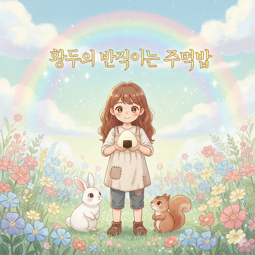 - 이미지 설명: 무지개 빛이 은은하게 감도는 하늘 아래, 알록달록한 꽃들이 가득한 정원 한가운데에 한 소녀가 서 있습니다. 소녀는 양손으로 작고 따뜻한 빛이 나는 주먹밥을 소중하게 감싸 쥐고 있으며, 소녀의 발치에는 귀여운 토끼와 다람쥐들이 몰려와 구경하고 있습니다. 제목은 황금색 글씨로 "황두의 반짝이는 주먹밥"이라고 적혀 있으며, 전체적으로 파스텔 톤의 포근하고 환상적인 분위기입니다.