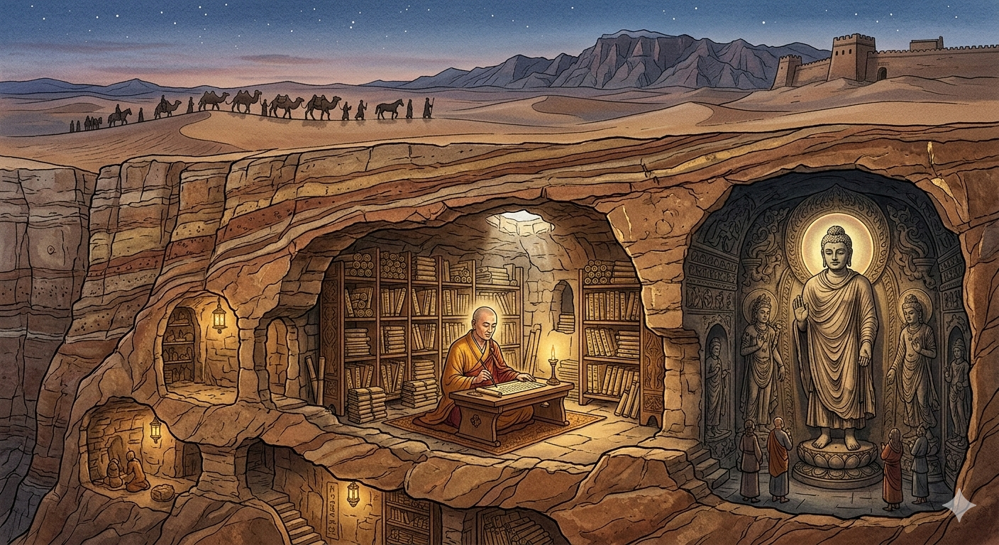 [한국어] 고대 서역의 석굴 사원 내부를 투시하는 듯한 신비로운 단면도 형식의 이미지입니다. 상단에는 모래 언덕 위를 지나는 카라반의 실루엣이 보이고, 지하 석굴 안에서는 구마라집 스님이 수천 권의 죽간과 양피지 경전에 둘러싸여 번역에 몰두하고 있습니다. 벽면에는 간다라 양식의 불상이 서구적 이목구비와 정교한 비단 가사를 입은 채 은은한 금빛 광채를 내뿜고 있습니다. 과거의 역사가 켜켜이 쌓인 지층 사이로 지혜의 빛이 스며드는 장엄한 광경입니다.